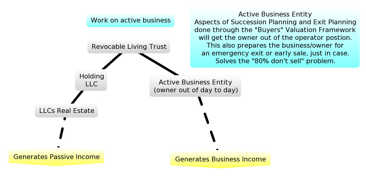 So far this has been a pretty standard outline. There is a financial planner, an accountant, an estate attorney, and potentially other professionals involved, even a bookkeeper. There could even be some succession planning done for the active business.The combination of these financial planning services has created an entity structure, or model, that looks fairly standard. However, what does this model resemble? It looks EXACTLY like the model used for starting a Small Business Holding Company for M&A Expansion.But, we've arrived at two major hurdles that so many businesses owners never get past, and this prevents the standard model from being used for M&A expansion.1. They are stuck working in the business, generally as part of the day-to-day operations, and therefore don't have the available time or capacity to do more.2. There's an unrecognized "something" that is wrong with their business that limits it's selling value and the owners ability to exit. In other words, something about the business prevents a buyer from wanting to buy it, or being able to buy it. This is why so few businesses are ever able to sell, and understanding how to solve this problem is what opens the door to M&A activities and allows the owner to properly exit the business from an operational perspective.The next phase is about solving these two problems.