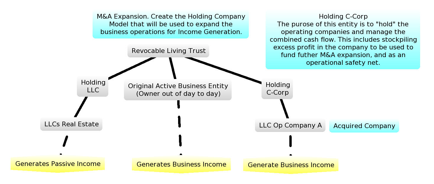 The focus here is on the first acquisition and creating the holding company that supports the M&A activities. There are other ways this could look, but this example is easy to understand.